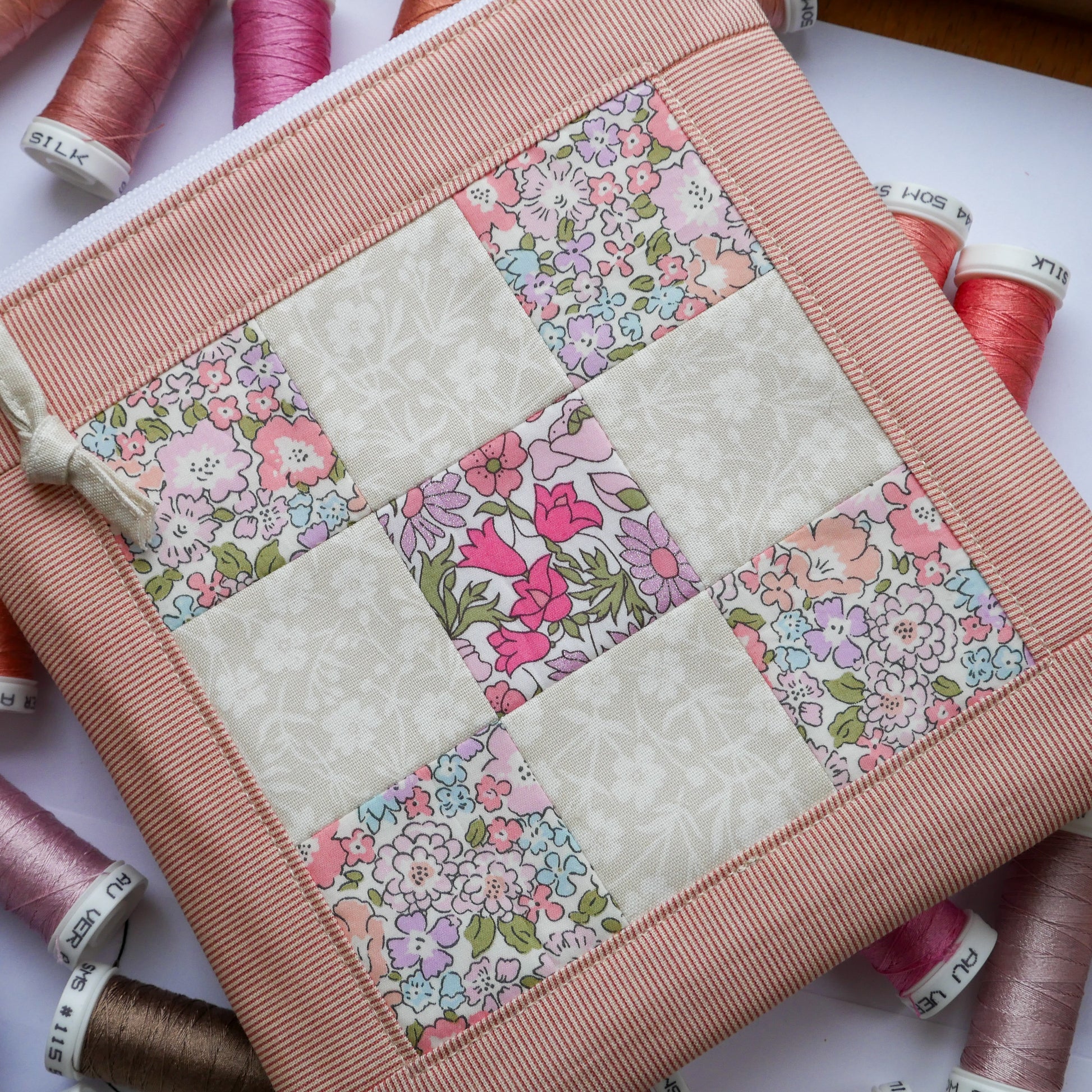The project bag and notions pouch are made from a collection of Liberty London Tawna Lawn and Liberty cotton quilting fabric with Moda stripes